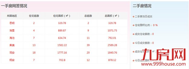 2015年9月19日,全市二手房成交套数为0套,二手房成交住宅套数成交0套,一手住宅成交51套,环比下跌40.00%。思明区2套,湖里区4套,海沧区7套,集美区13套,同安区18套,翔安7套。