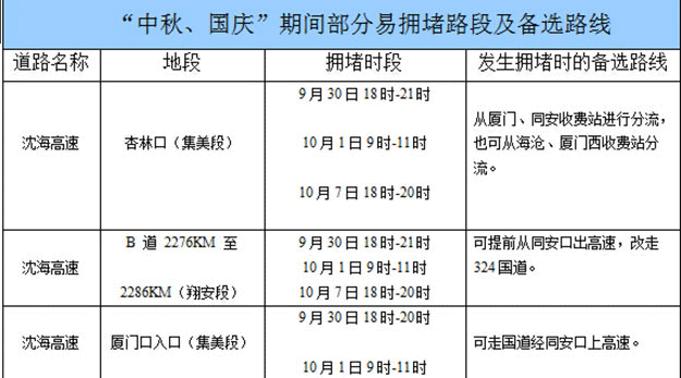 根据厦门高速交警分析,翔安收费站为全省车流量最大的收费站,车流高峰期难免拥堵;沈海高速杏林收费站出入口匝道,受集灌路施工改造影响容易拥堵;厦门收费站是沈海高速和厦沙高速车流汇集处,该站入口车道较少,也容易堵。此外,厦蓉高速厦门段部分匝道未开通,驾驶人要根据交通指示标识行驶,不要强行进入,以免发生危险。