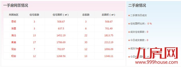 2015年10月1日,全市二手房成交套数为0套,二手房成交住宅套数成交0套,一手住宅成交55套,环比下跌70.27%。思明区3套,湖里区3套,海沧区13套,集美区17套,同安区7套,翔安12套。