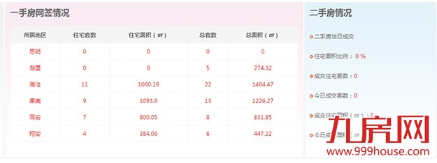 2015年10月2日,全市二手房成交套数为0套,二手房成交住宅套数成交0套,一手住宅成交31套,环比下跌43.64%。思明区0套,湖里区0套,海沧区11套,集美区9套,同安区7套,翔安4套。