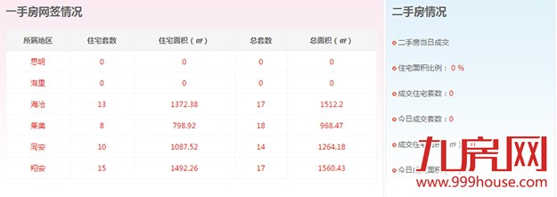 2015年10月5日,全市二手房成交套数为0套,二手房成交住宅套数成交0套,一手住宅成交46套,环比上涨76.92%。思明区0套,湖里区0套,海沧区13套,集美区8套,同安区10套,翔安15套。