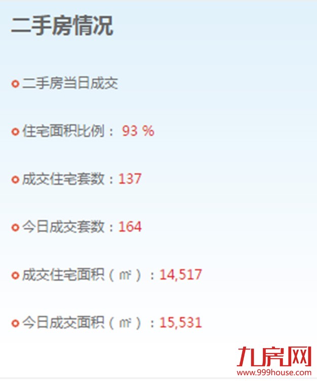 2015年10月8日,全市二手房成交套数为164套,二手房成交住宅套数成交137套,一手住宅成交102套,环比上涨117.02%。思明区2套,湖里区3套,海沧区18套,集美区32套,同安区20套,翔安27套。
