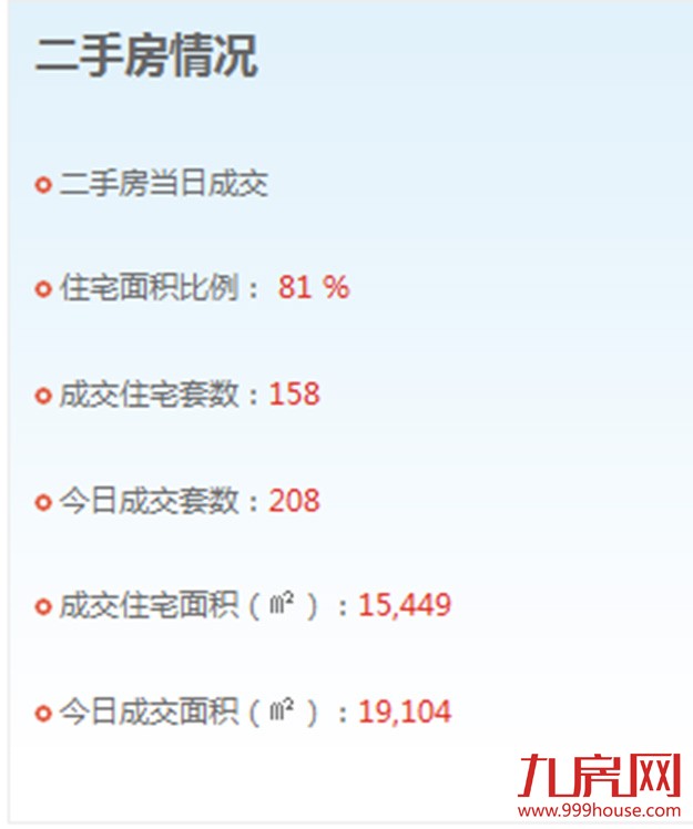 2015年10月12日,全市二手房成交套数为208套,二手房成交住宅套数成交158套,一手住宅成交100套,环比下跌18.03%。思明区4套,湖里区1套,海沧区17套,集美区35套,同安区28套,翔安15套。