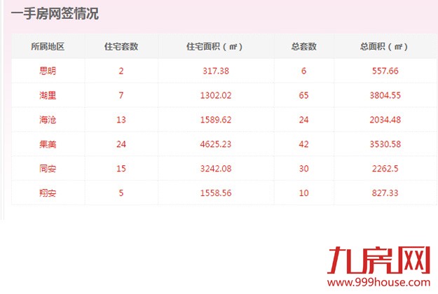 2015年10月13日,全市二手房成交套数为0套,二手房成交住宅套数成交0套,一手住宅成交66套,环比下跌34.00%。思明区2套,湖里区7套,海沧区13套,集美区24套,同安区15套,翔安5套。