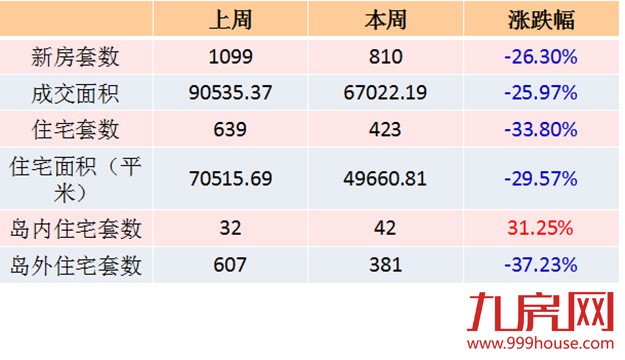 本网根据官方数据统计,本周(10月12日—10月18日,其中10.17、10.18暂无备案数据)全市一手住宅成交423套,环比下跌33.80%,日均成交60套。