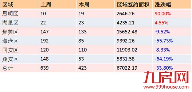 从各区成交情况看,集美区一手住宅成交133套,环比下跌9.52%,位居一手住宅成交排行榜首位;同安区成交110套,环比下跌8.33%,居一手住宅成交排行榜第二位;海沧区一手住宅成交85套,环比下跌55.73%,位居一手住宅成交排行榜第三位。