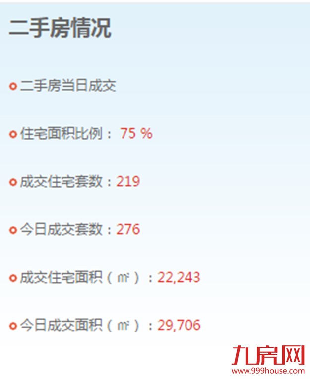 2015年10月26日,全市二手房成交套数为276套,二手房成交住宅套数成交219套,一手住宅成交118套。思明区5套,湖里区10套,海沧区25套,集美区41套,同安区20套,翔安16套。