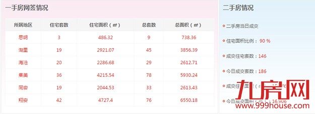 2015年10月29日,全市二手房成交套数为186套,二手房成交住宅套数成交146套,一手住宅成交139套。思明区3套,湖里区19套,海沧区20套,集美区36套,同安区19套,翔安42套。