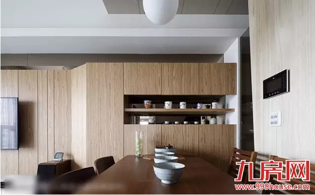 ★★延续电视主墙的质材,於餐桌旁规划收纳展示柜,展现场域的丰富表情。