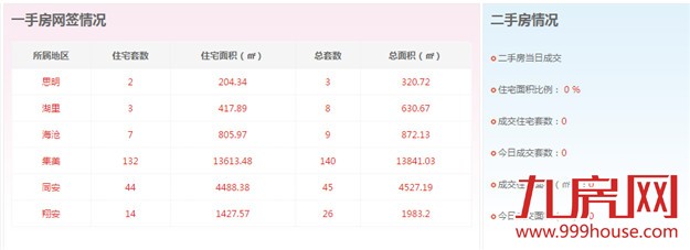 2015年11月15日,全市二手房成交套数为0套,二手房成交住宅套数成交0套,一手住宅成交202套。思明区2套,湖里区3套,海沧区7套,集美区132套,同安区44套,翔安区14套。