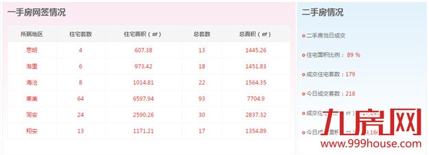 2015年11月16日,全市二手房成交套数为218套,二手房成交住宅套数成交179套,一手住宅成交119套。思明区4套,湖里区6套,海沧区8套,集美区64套,同安区24套,翔安区13套。
