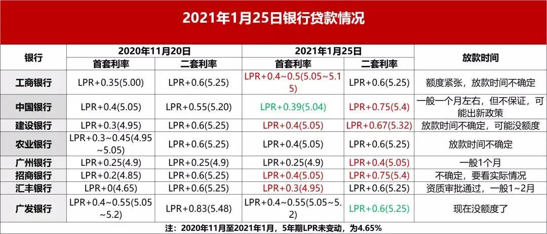 此外,根据广州本地媒体调查报道,相比2020年11月,今年1月8个银行中有一半银行的首套房贷利率、二套房贷利率上涨。