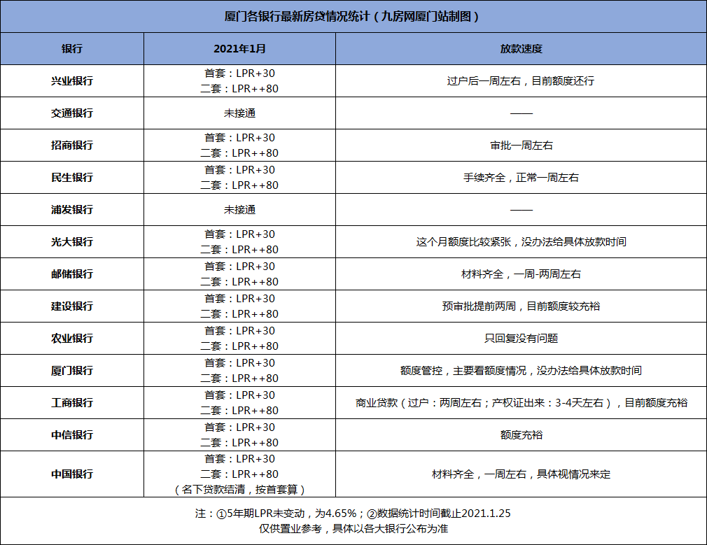 根据调查,目前厦门各大主流银行,均是执行LPR(利率4.75%)。其中,首套房加点30基点,二套房普遍加点80基点。