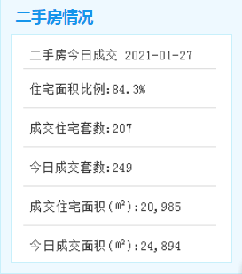 2021年1月27日,厦门二手房成交249套,成交面积24894㎡;其中二手住宅成交207套,成交面积20985㎡。