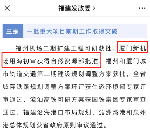 近日,福建发改委发文《2020年我省重点交通项目投资全面超额完成任务》,其中提到,厦门新机场用海初审获得自然资源部批准,这意味着,厦门新机场迈入建设新阶段。