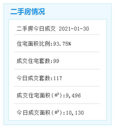 2021年1月30日,厦门二手房成交117套,成交面积10130㎡;其中二手住宅成交99套,成交面积9496㎡。