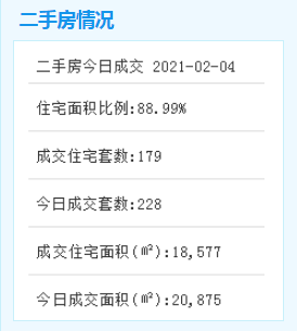2021年2月4日,厦门二手房成交228套,成交面积20875㎡;其中二手住宅成交179套,成交面积18577㎡。