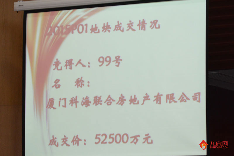 3月19日2015P01商住地位于湖里五缘湾片区枋湖北二路东侧,占地面积23328.464平方米,建筑面积50060平方米,拍卖总起价52500万元,起拍楼面价10487.41元/平方米,由厦门科海联合房地产有限公司52500万元底价成交。