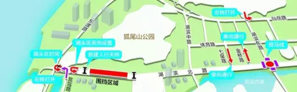 ◆七星路体育路至湖滨北路段实行由北往南(即体育路往湖滨北路方向)单向交通组织措施,禁止机动车由南往北通行;