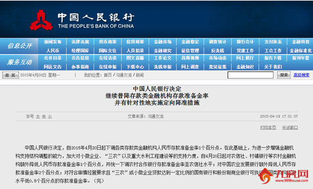 4月19日央行再次宣布,自2015年4月20日起下调各类存款类金融机构人民币存款准备金率1个百分点,幅度大大超过了2月5日下调的0.5个百分点。业内人士分析,央行再次降准,意味着银行可贷款额度明显增加,将有利于“330房贷新政”的落实,房贷利率折扣有望加大,房企的融资成本有望降低。另外,在许多新政策的“组合拳”下,购房者的市场预期将会发生转变,房企去库存步伐有望加快,部分城市或将出现量价齐涨的态势。