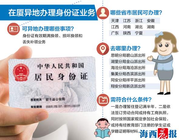 11省市居民可在厦异地办理身份证, 6个行政派出所试行办3项业务。11个外省市的居民,只要符合条件,即可在厦门办理居民身份证有效期满换领、损坏换领和丢失补领业务。这是警方继省内居民跨地办理身份证业务之后,推出的又一项便民举措。昨天,记者从厦门市公安局获悉,首批在福建省开展跨省居民身份证异地受理的省份为天津、江苏、浙江、安徽、江西、河南、湖北、湖南、广东、陕西、宁夏等11个省(自治区、直辖市)。(→点击阅读详情)