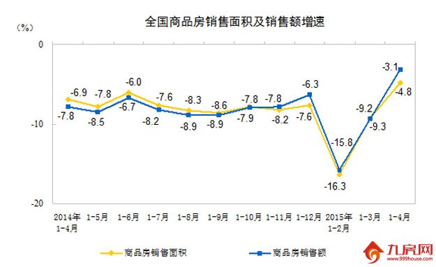 国家统计局发布《2015年1-4月份》,最新数据显示,今年1~4月,全国房地产开发投资同比增长6.0%,比一季度回落2.5个百分点。但随着多项调控政策效果逐渐显现,房地产市场呈现出一些新的变化,商品房销售面积和销售额降幅收窄。