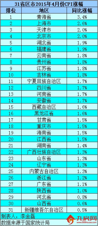 5月15日国家统计局近日公布了全国31个省(区、市) 4月份居民消费价格指数(CPI)。数据显示,25个省份4月份CPI涨幅较3月回升,16个省份的涨幅超过了全国水平。虽然大部分地区CPI出现回升,但对于未来物价走势,国家信息中心经济预测部主任祝宝良此前接受中新网记者采访时表示,当前国际经济复苏乏力,大宗商品价格下跌,国内产能过剩问题依然存在,预期全年物价将低位运行。