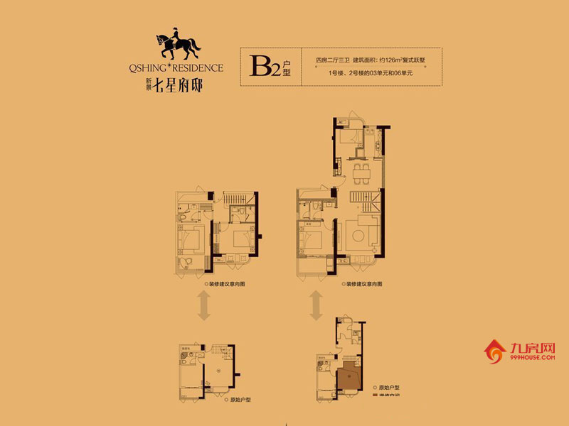 B2户型为126㎡复式四房。该户型为【新景七星府邸】最具颠覆创意的户型,首创下沉式复式户型,让您体会都教授一般的居住感受。独享圆弧豪华观景台,超凡气派,品位优雅生活。